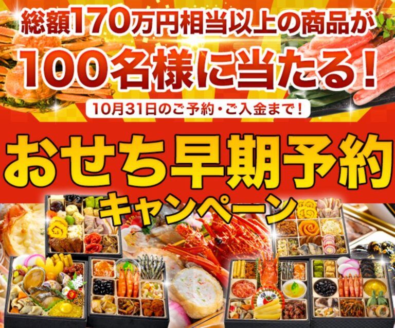 快適生活(おせち専門サイト)とは | 「快適生活(おせち専門サイト)」は、年末年始の食卓に彩りを添える高品質なおせち料理をお届けする通販サイトです。厳しい品質管理基準をクリアした商品だけを提供しており、実際に「見て」「使って」「食べて」自信を持って販売しています。冷凍保存で保存可能なため、忙しい年末年始でも安心して準備ができます。サイズは2~3人前から6~7人前まで幅広く、家族構成に合わせて選べるのも魅力。さらに、早期予約で最大7,000円引きのスーパー早割や、送料無料キャンペーンも実施中です。指定した日時に確実に届けてもらえるため、受け取りも安心。特典として祝箸や総額170万円相当の商品が当たるキャンペーンもあり、楽しみながらおせち選びができます。家計に優しく、手間をかけずにおせちを楽しみたい方にぴったりです。 |